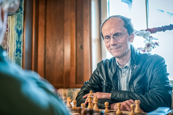 Auch nicht gerade das, was wir uns von dieser Paarung erhofft haben. Peter macht aus einer ausgeglichenen Eröffnung heraus zwar Druck am Damenflügel und steht eine Spur besser, aber irgendwie findet er den Dosenöffner nicht. Relativ früh einigen sich die beiden auf Remis – ich habe den Verdacht, dass es etwas mit Peters friedlichem Gemüt zu tun haben muss. Er selbst meint im Nachgang, es habe ihm an Nerven und Geduld gefehlt. Nachvollziehbar, wie ich meine.