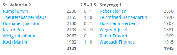 Interessante Partie von der Eröffnung weg, von Erwin, dem seltenen Valentiner Gastspieler, vielleicht ein wenig zu optimistisch vorgetragen. Florian verteidigt sich (trotz miserabler Sicht, die Lichtbedingungen auf Brett 1 sind ab ca. 17 Uhr katastrophal) umsichtig, schnappt die angebotene Figur und bringt den überraschenden Punkt für Steyregg ins Trockene.
